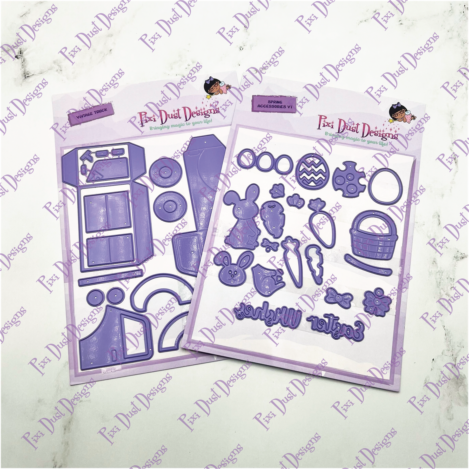 Here comes the Easter truck! Fill the Vintage truck die with some great Easter goodies using the Spring Accessories die set. This bundle includes the Vintage truck die set and the coordinating Spring Accessories VT die set.